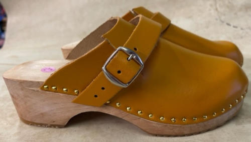 MUSTARD SLIP ON WITH BUCKLE This very popular slip on clog is manufactured with an adjustable instep strap. The clogs are fitted with a durable soling material. and are renowned for their comfort. Uppers 100% leather Soles 100% wood Soling material rubber