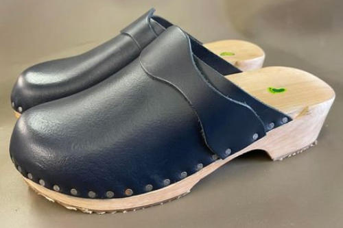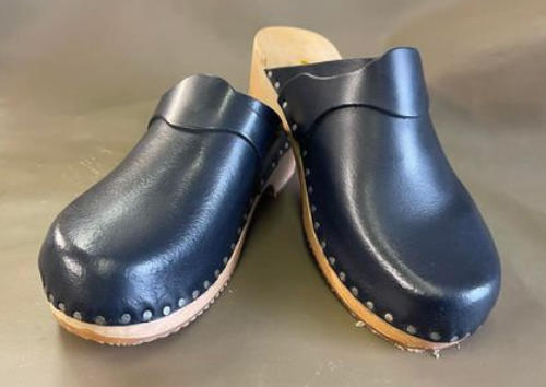 At the clog shop we have developed a new style of mens slip on. These are a much better style, especially if you struggle to keep on slip on clogs. The upper comes further up the instep, which holds the foot more securely in place. Manufactured out of strong firm leathers. Can also be made in other colours. Finished off with a stylish strap.