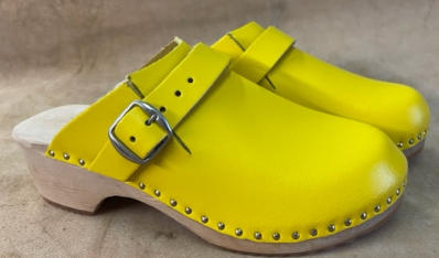 Yellow Slip On with buckle This very popular slip on clog is manufactured with an adjustable instep strap. The clog is fitted with a durable soling material, and a wide choice of different colours of leathers to choose!